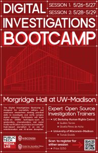 The Digital Investigations Bootcamp is the first intensive, hands-on OSINT training program in the Midwest designed specifically for journalists, OSINT practitioners, editors, and newsroom researchers. Hosted by the Public Tech Media Lab at the School of Journalism & Mass Communication at the University of Wisconsin–Madison.